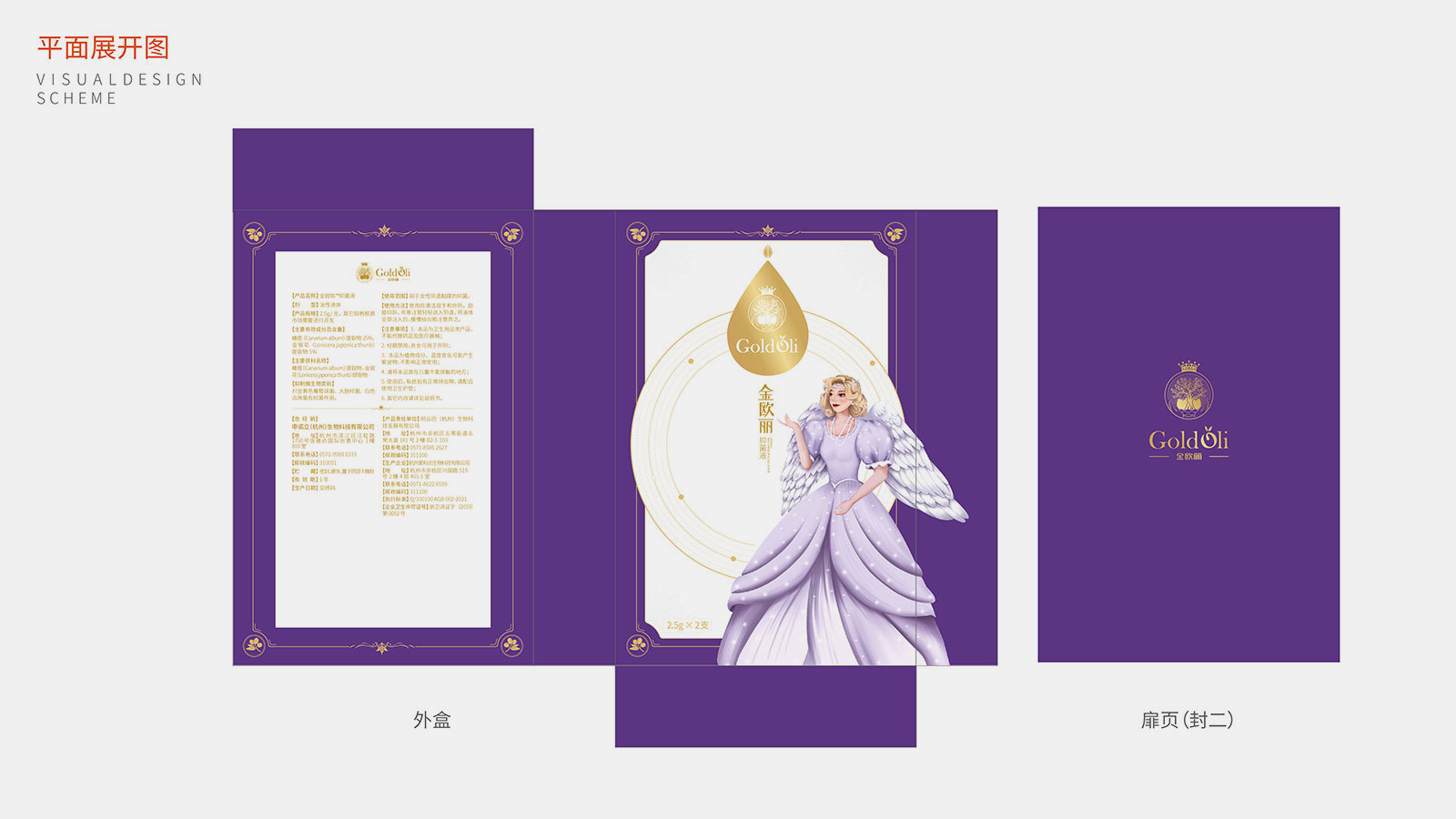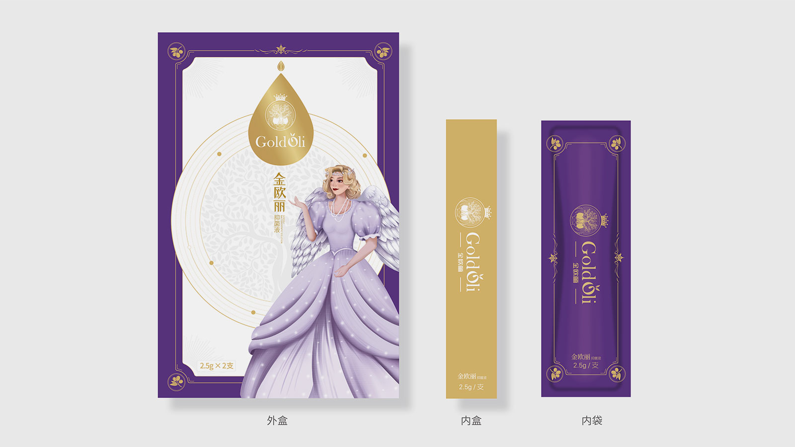 石特在創意思考之前,針對品牌進行全維調研與洞察,對現有包裝進行全面診斷分析,提煉出產品核心主張——每個女人都是自己的公主,并以此為發散點,以公主的IP人物形象進行畫面創作,同時包裝畫面突出風格鮮明的西班牙王室元素,加強產源地背書及產品核心賣點凝練。包裝運用女性紫與尊貴金的色彩進行渲染,時尚醒目,記憶點十足。細細品味,包裝處處體現尊貴與呵護,整體來看,包裝解決了金歐麗品牌與受眾利益訴求之間的溝通不順的問題,以市場化、差異化的表現手法將品牌展現的淋漓盡致,獲得客戶一致好評!