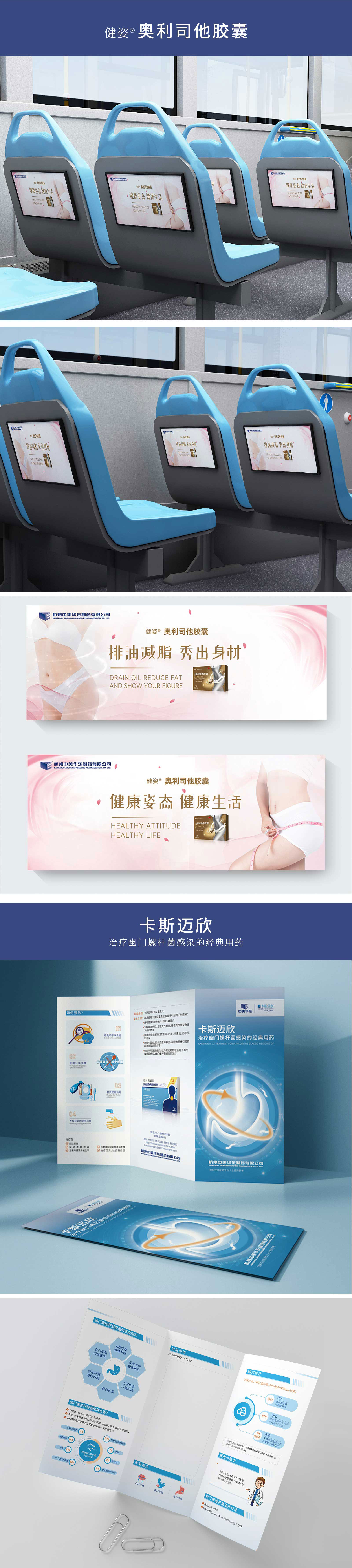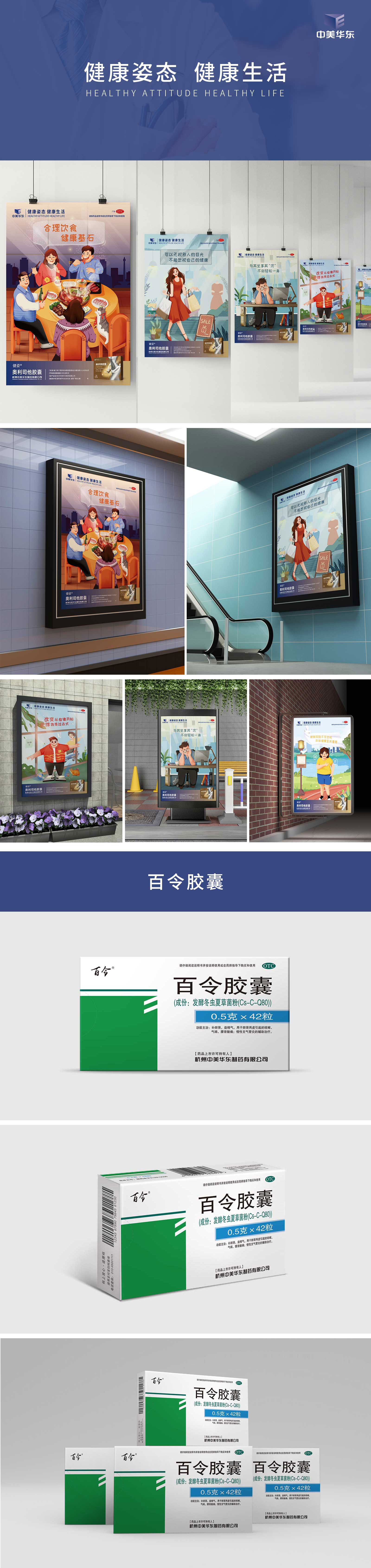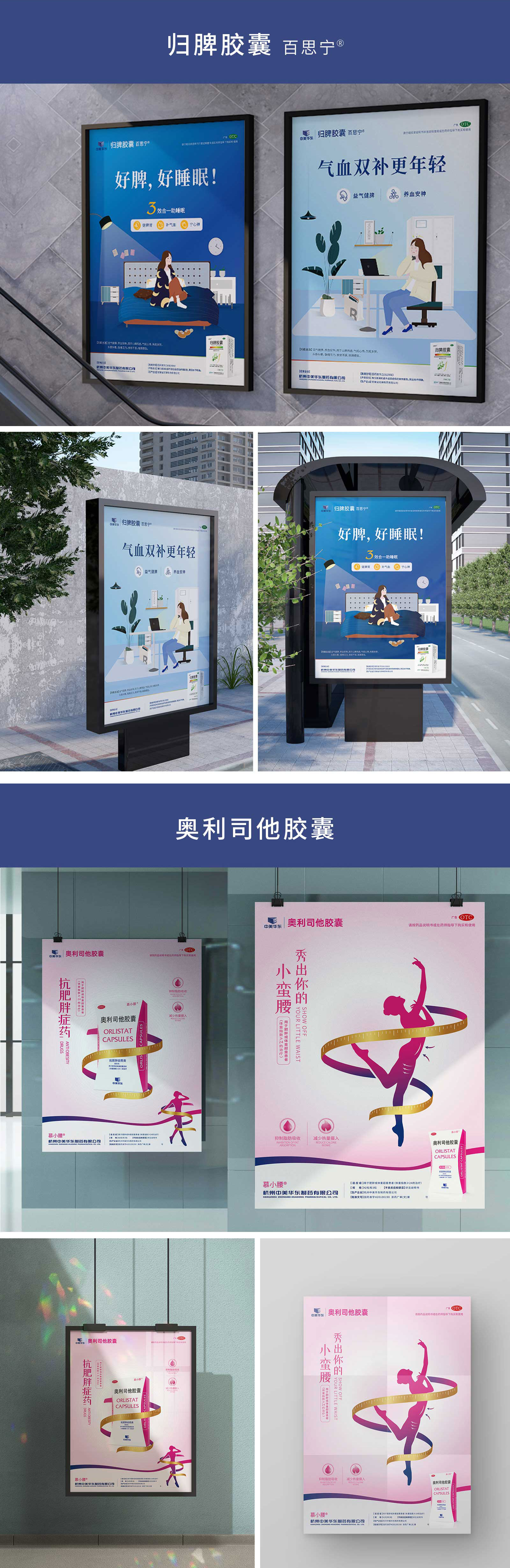 本次我們為華東醫藥股份有限公司的五款產品進行策劃創意、藥品包裝設計、折頁設計及海報設計的任務。石特在深入研究目前市面上的藥品廣告后,發現大多數藥品廣告夸大其藥用功效,并且千篇一律,使得宣傳的效果微乎其微,基于此,石特轉變創作思路。在”奧利司他膠囊”以及“歸脾膠囊 百思寧”的海報設計上的海報設計上,我們根據產品的特有功效,結合現在設計流行趨勢,利用原創手繪插畫的方式進行了海報的創意設計,我們巧妙利用插畫獨特的藝術魅力,將文字、情感、故事以視覺化的方式呈現,選取日常的場景,利用這種方式將藥品的功效、作用通過畫面進行呈現。不僅在視覺上以新穎的方式吸引到受眾的注意,同時也進一步凸顯了華東醫藥的品牌形象。在“百令膠囊”藥品的包裝設計上,為呈現產品藥物療效,利用簡約不簡單的版式設計進行突出。在“奧利司他膠囊 小蠻腰”的藥品海報設計上,選用代表女性常用的粉色,在視覺第一時間給人以沖擊,利用“卷尺”及優美的女性“剪影”,這些極具帶有女性意義的元素來展現藥品醫用的療效,十分形象的表達出宣傳的要義。在“卡司邁新”藥品的折頁設計上,采用圖文并茂的形式,使得版式清晰明了,不僅能夠直接表明藥品的醫用功效,而且在使得閱讀體驗感極佳。本次石特為華東醫藥股份有限公司的創意策劃,得到了客戶的高度認可。